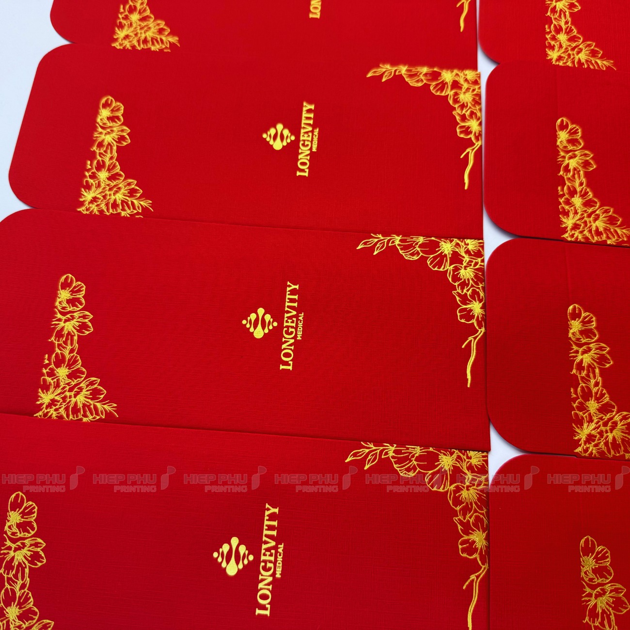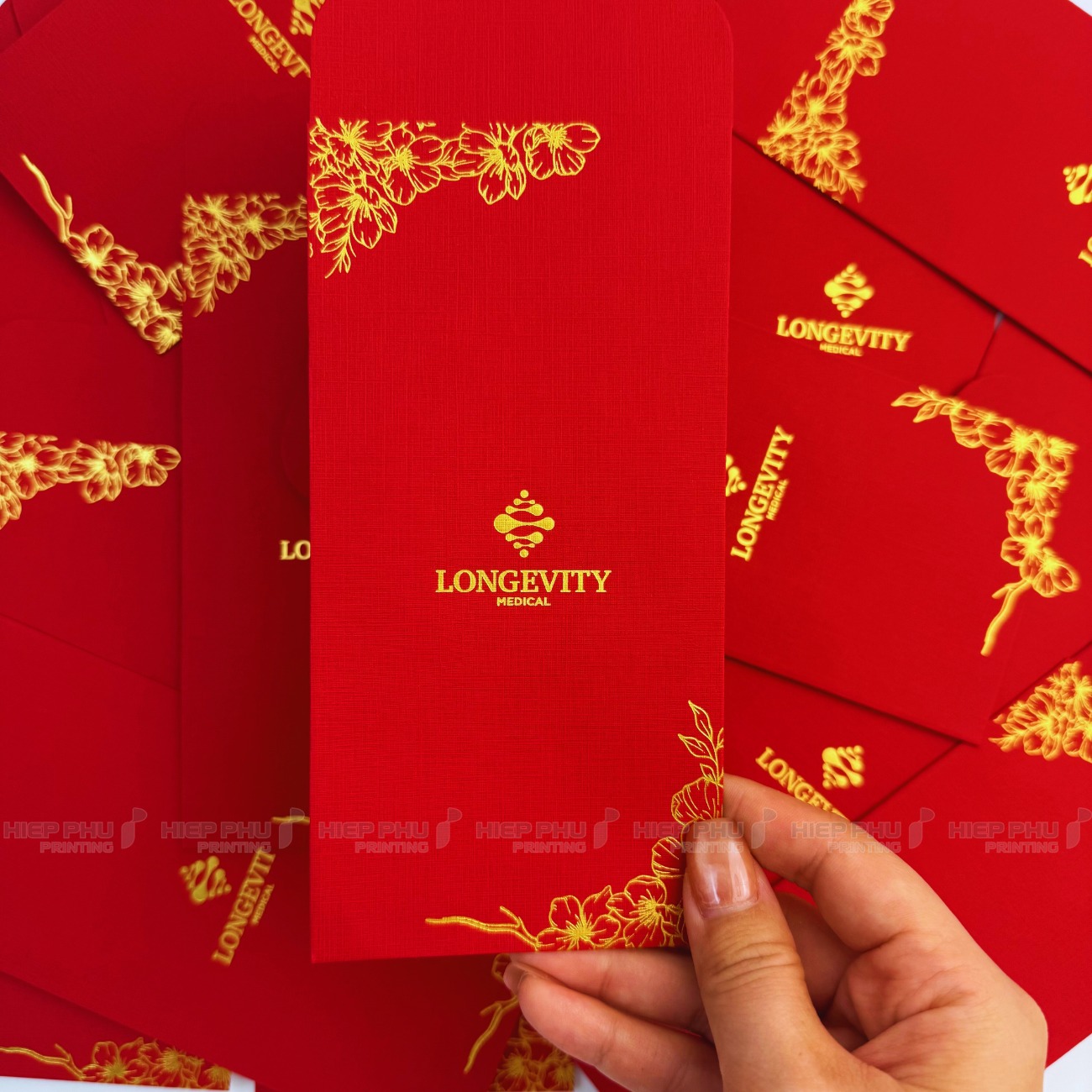 Mẫu lì xì Tết Longevity do In Hiệp Phú thực hiện sử dụng tông đỏ ánh kim nổi bật, mang đến cảm giác sang trọng và cao cấp ngay từ ánh nhìn đầu tiên.