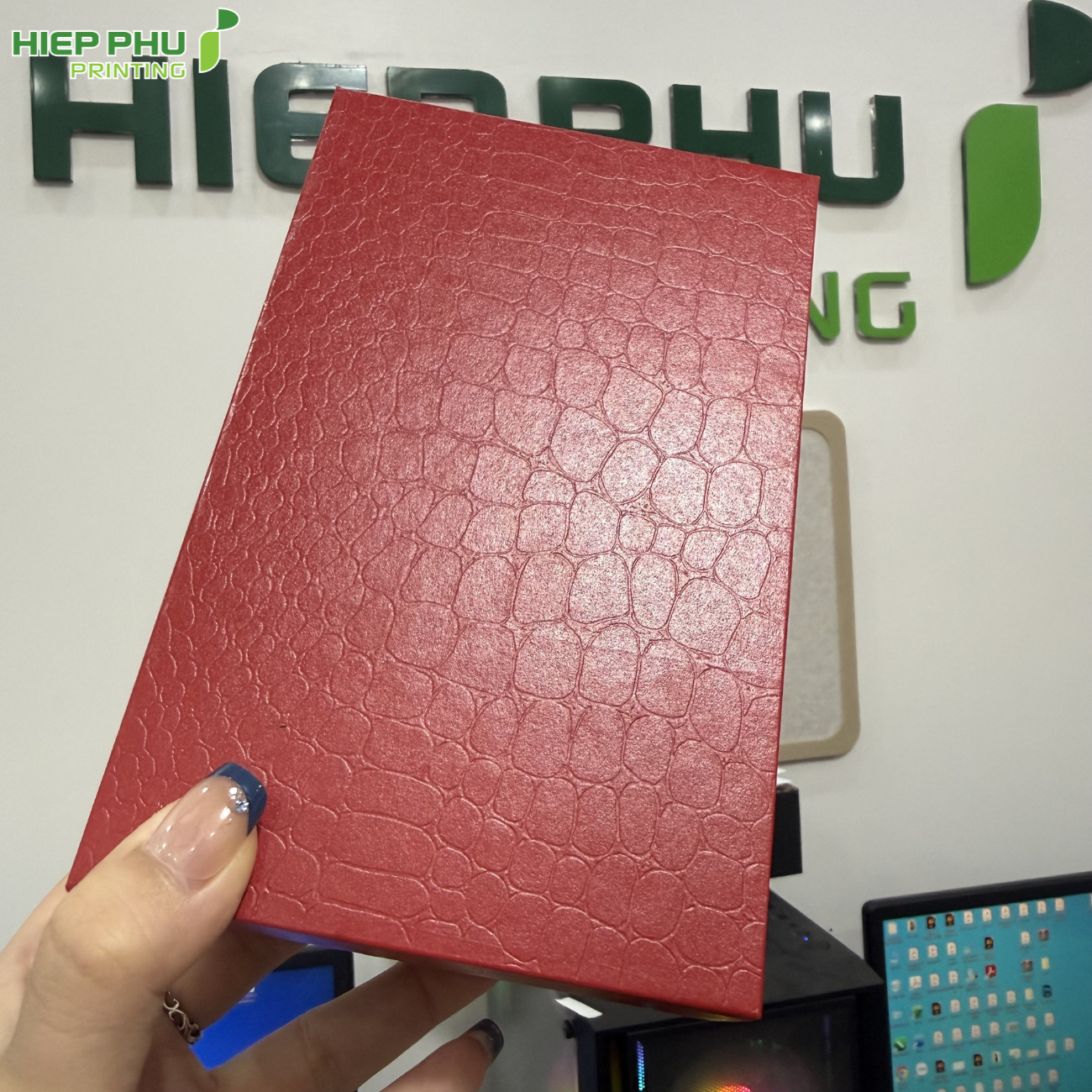 Gia công tinh xảo: Ngoài việc ép vân da, Hiệp Phú còn cung cấp các dịch vụ gia công cao cấp như ép kim logo (Gold/Silver), phủ UV định hình, hoặc lót nhung/lụa bên trong hộp.