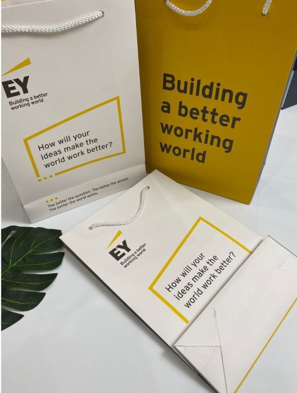 EY đặt in túi giấy tại Hiệp Phú Printing được làm từ giấy Couche-giấy chất lượng cao, 2 mặt trắng sáng, mềm mịn, bóng loáng. Khả năng bám dính cao, mực in sắc nét.