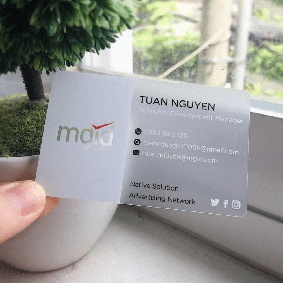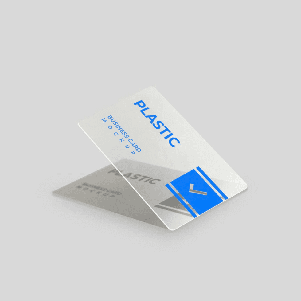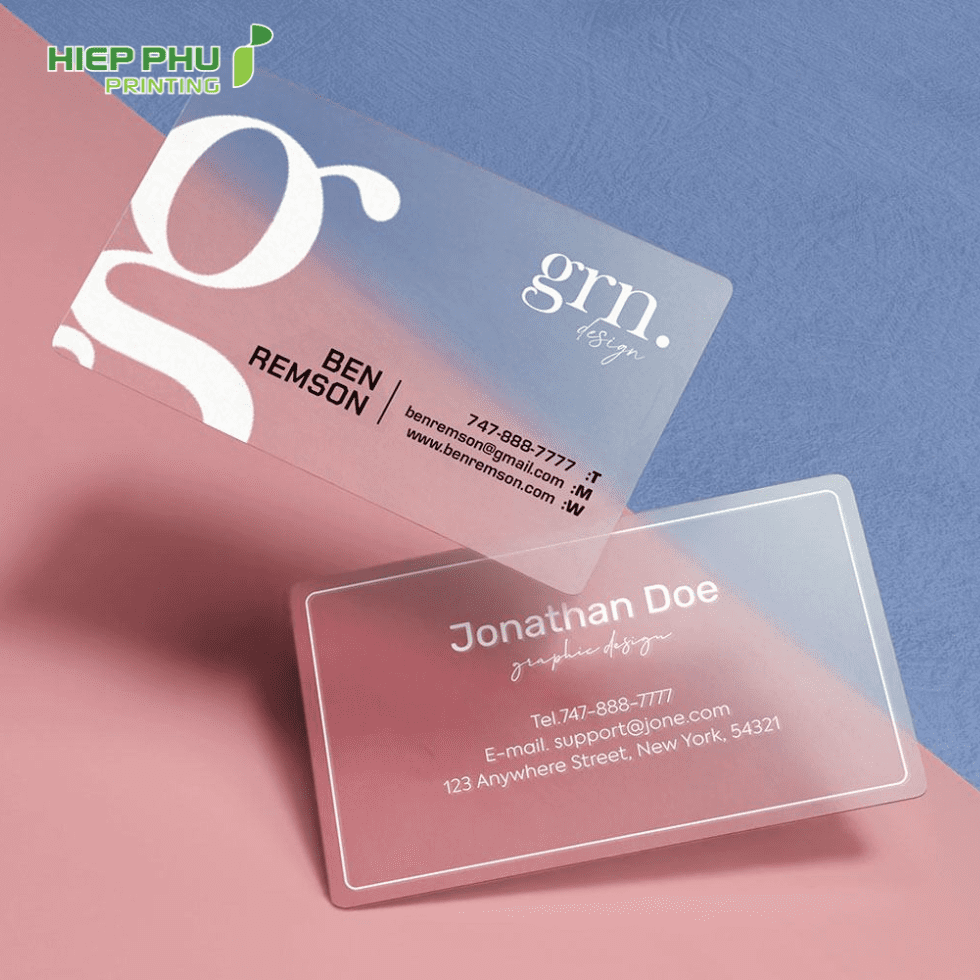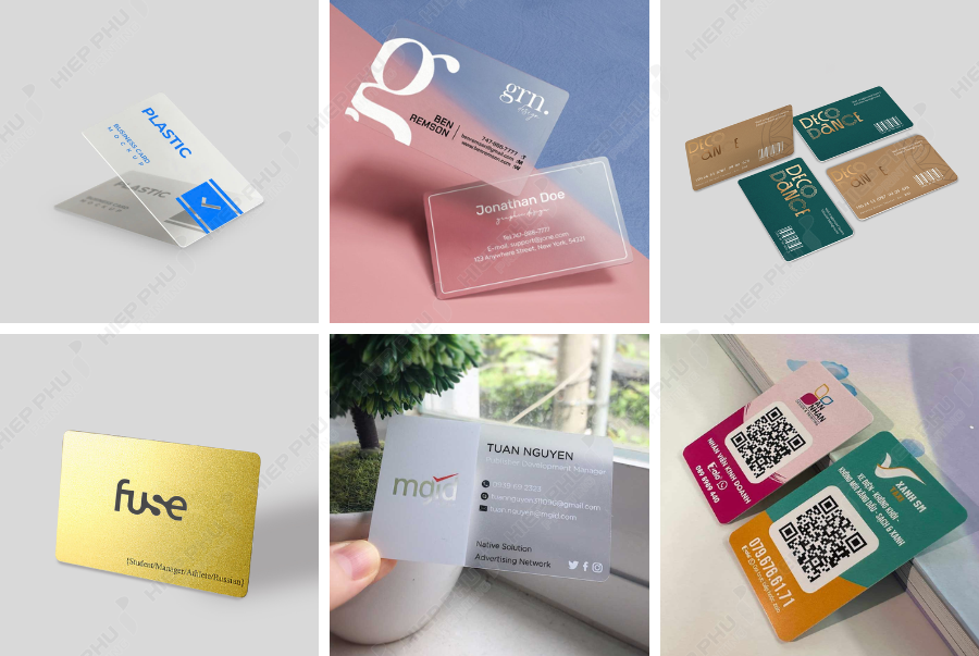 - Name card nhựa PVC: Là loại name card được làm từ nhựa PVC (polyvinyl chloride), chúng thường mỏng, dẻo và bền. Thường có độ trong suốt và có thể in ấn được hình ảnh và thông tin trên bề mặt.