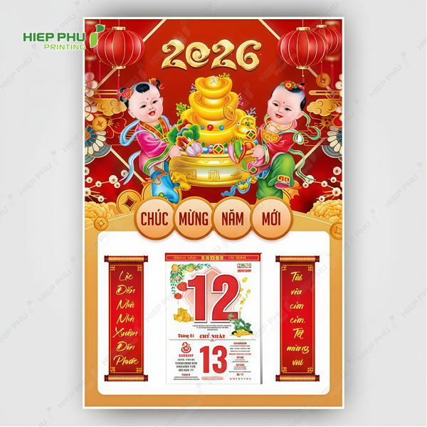 - Lịch treo tường 13 tờ: tấm bìa to kích thước 35 x 70 cm, phía dưới gắn 13 tờ lịch gồm tờ bìa thông tin chung, 12 tờ bên trong tương ứng với 12 tháng của năm.