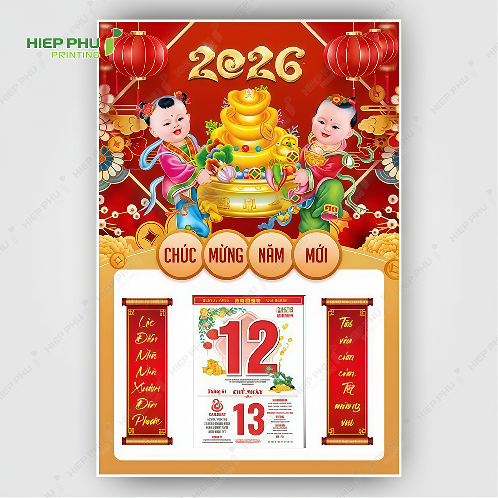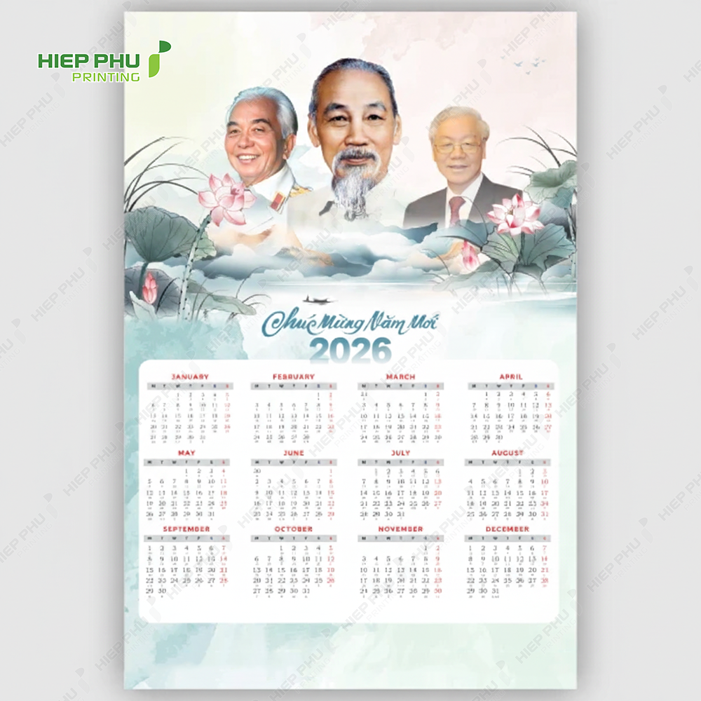 - Lịch treo tường 1 tờ: kích thước thông dụng 45cm x 70cm, định lượng 80gsm đến 100gsm.