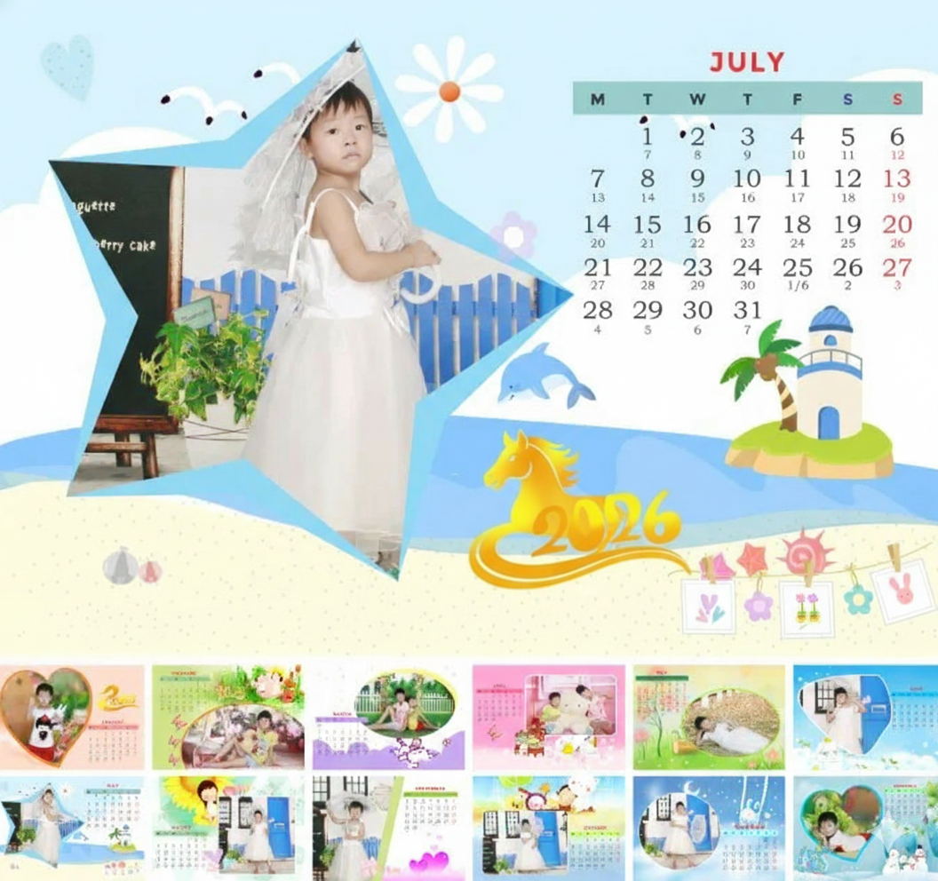 - Lịch treo tường 7 tờ: 210gsm – 250gsm, khổ in 40cm x 60cm, 35cm x 70cm.