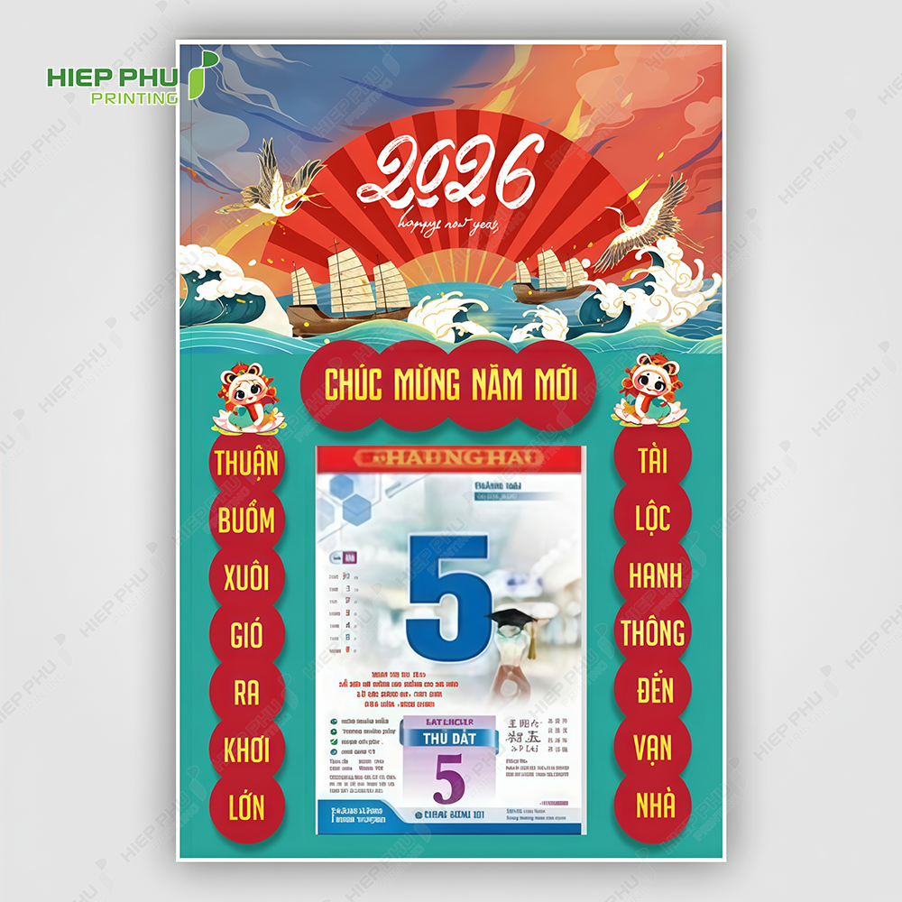 - Lịch treo tường 5 tờ: kích thước thông dụng là 40cm x 60cm, 35cm x 70cm trên chất liệu giấy Couche định lượng từ 120gsm – 150gsm.