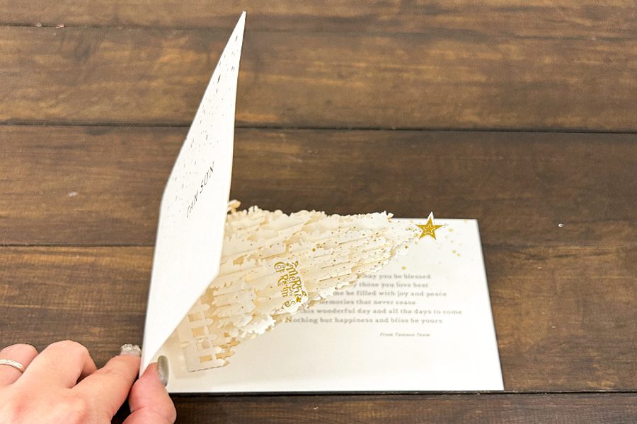 Bề mặt thiệp có thể in họa tiết, logo, lời chúc cá nhân hóa, đồng thời được gia công tinh tế với các kỹ thuật ép kim, phủ UV, bế nổi hoặc dập chìm. Nhờ đó, từng tấm thiệp 3D không chỉ là món quà mà còn là tác phẩm nghệ thuật mang giá trị thẩm mỹ cao.