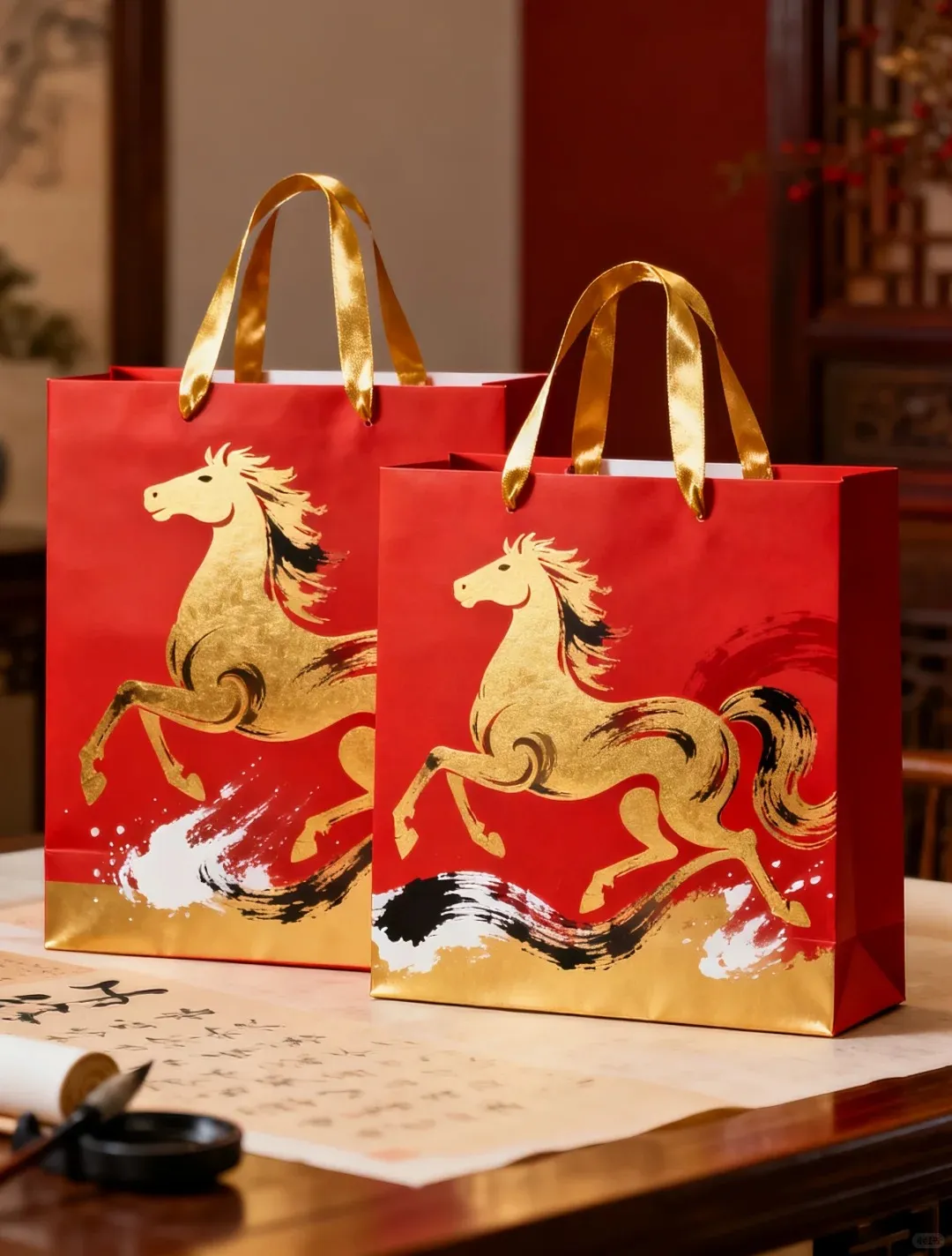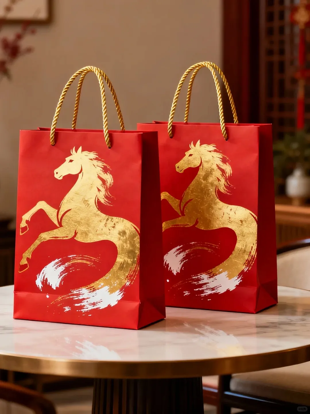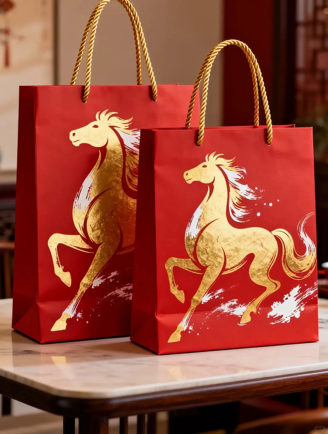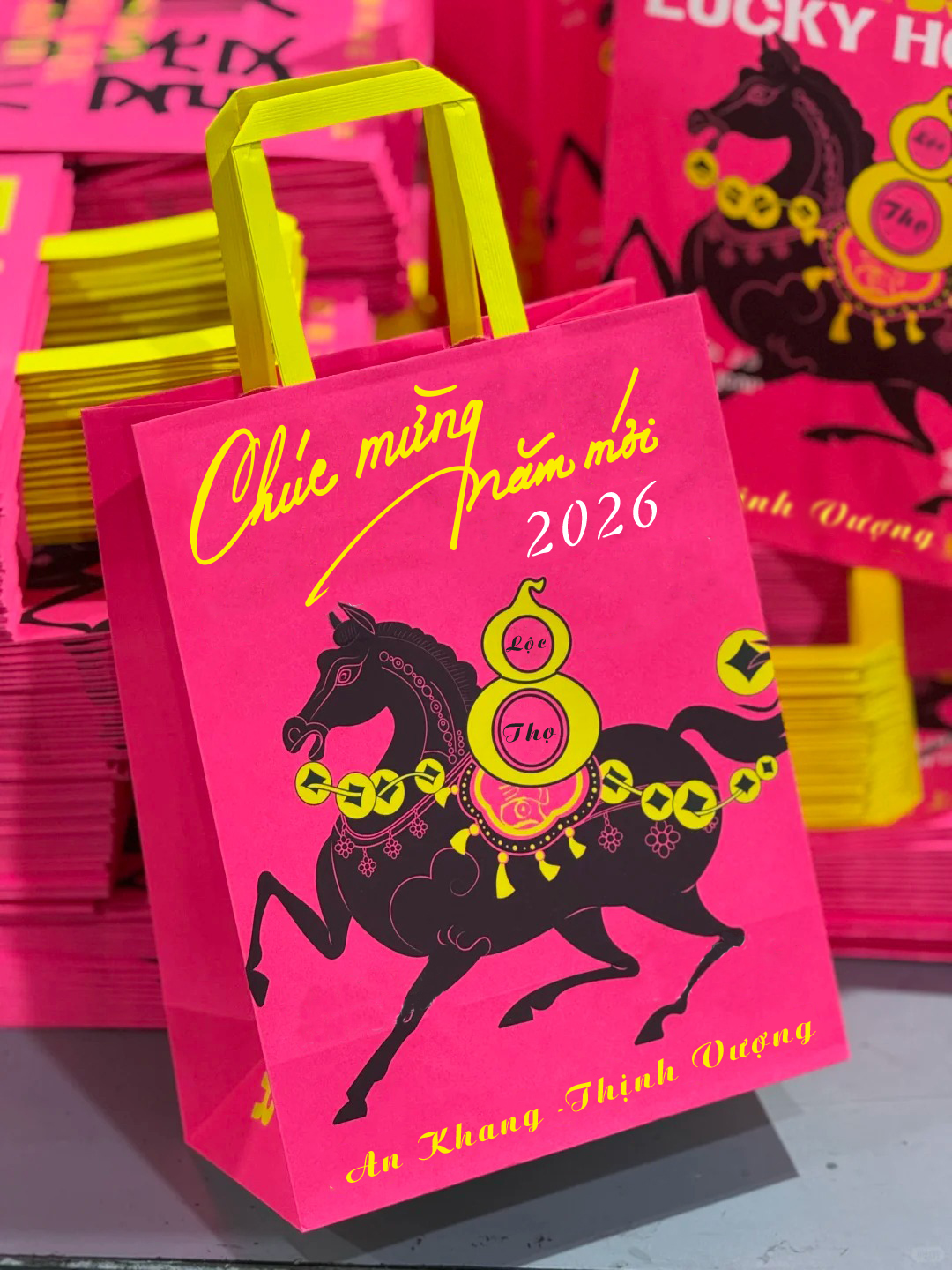 Những hình ảnh chú ngựa, hoa mai, đèn lồng hay gia đình sum vầy được ứng dụng rộng rãi trong thiết kế túi giấy Tết 2026, giúp sản phẩm của bạn thêm tinh tế và đậm không khí xuân.
